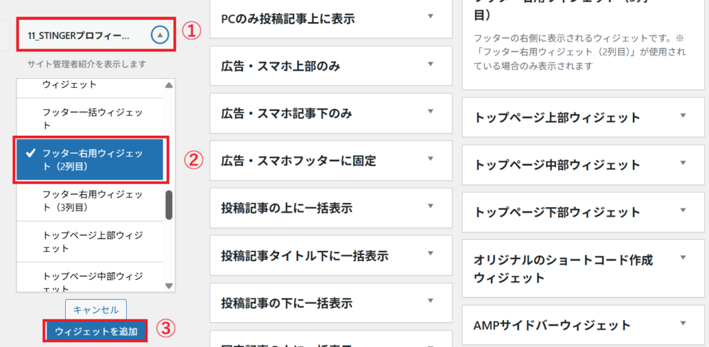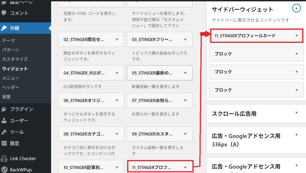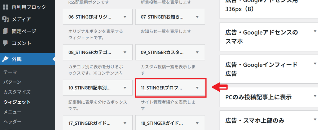②ウィジェット一覧から「11_STINGERプロフィールカード」を探します。