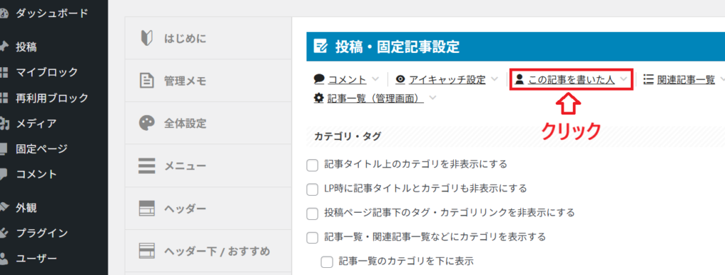 STEP4 「この記事を書いた人」を記事下に設置する(任意) AFFINGER管理→投稿・固定記事