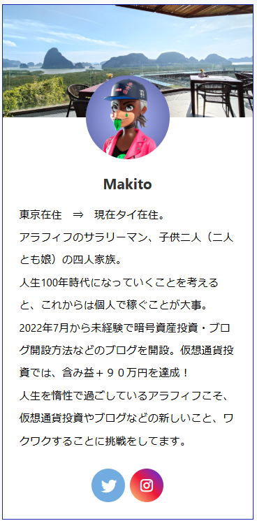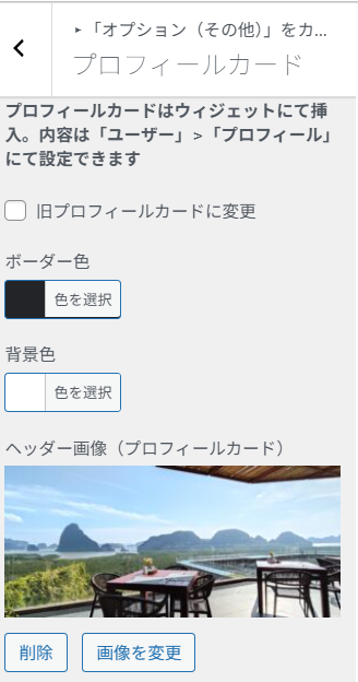 フッターに設置する場合は、旧プロフィールカード(横型)がおすすめです。理由は、フッターは横幅が広いため、縦型のプロフィールカードだと大きく表示されすぎてしまうからです。