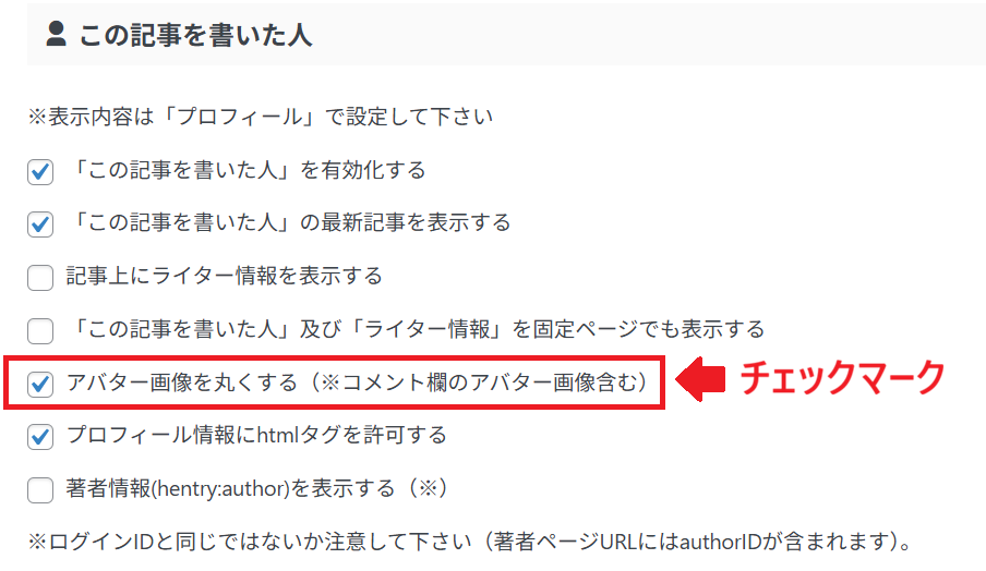 • アバター画像を丸くする」「HTMLタグを許可する」の2つをチェックして使いやすく!