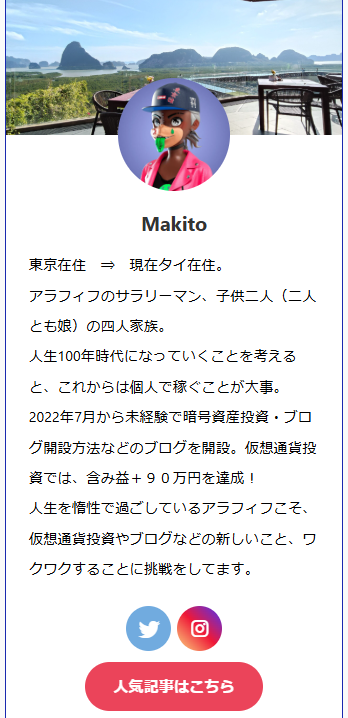 サイドバートップにプロフィールカードがあると、初めて訪れた読者さんが「どんな人が書いているブログなんだろう」とすぐに確認できます。ぜひ一番上に設置してみてください!