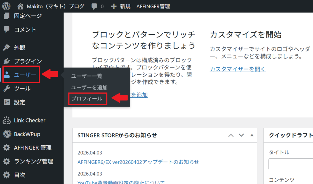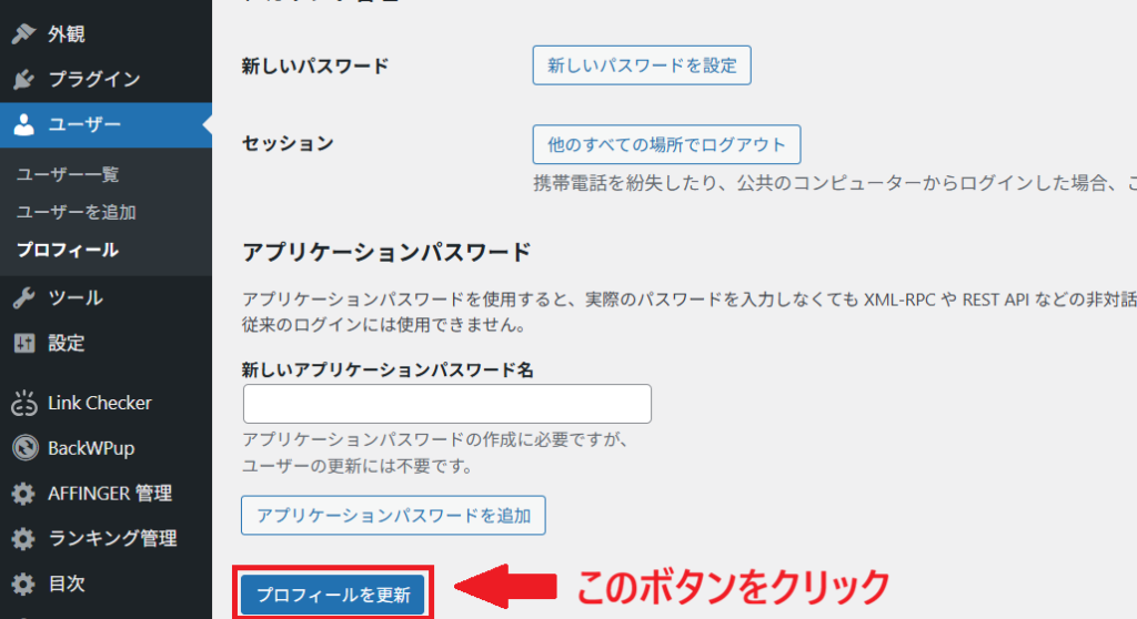 ①WordPress管理画面から「ユーザー」→「プロフィール」をクリックします。