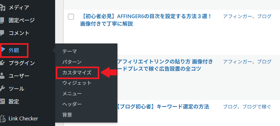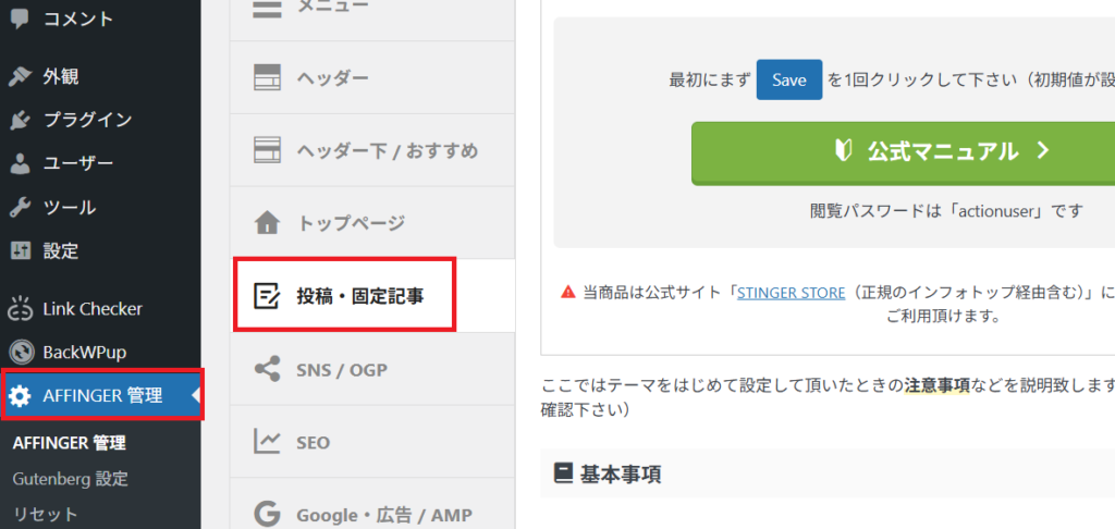 ①「AFFINGER管理」→「投稿・固定記事」をクリックします。