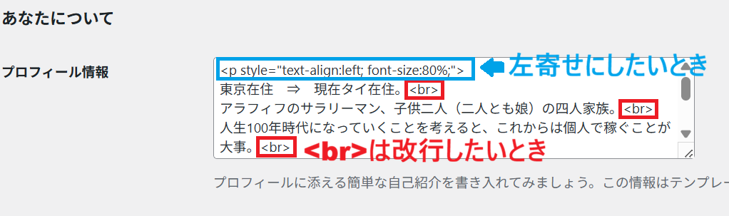③プロフィール情報の入力欄に戻り、改行したい場所に <br> を入力します。